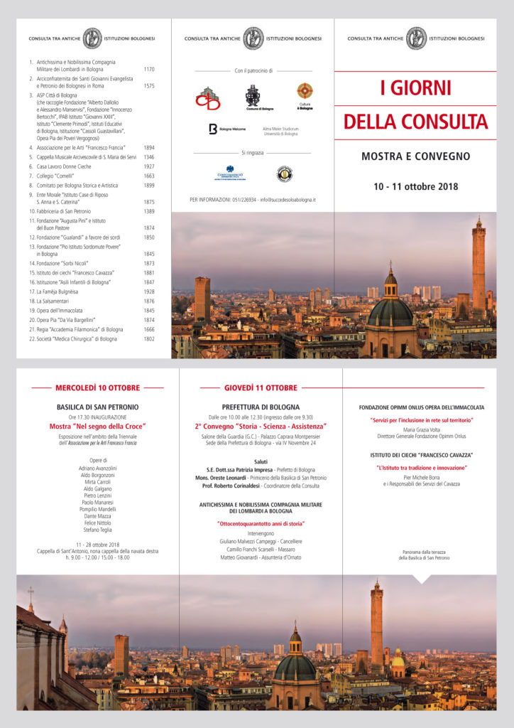 Una bellissima mostra nella suggestiva Basilica di San Petronio e un interessante convegno nella prestigiosa sede della Prefettura per due giornate dedicate ai temi più cari alla Consulta e alla sua azione al servizio della città: storia, scienza e assistenza. Mercoledì 10 e giovedì 11 ottobre 2018.