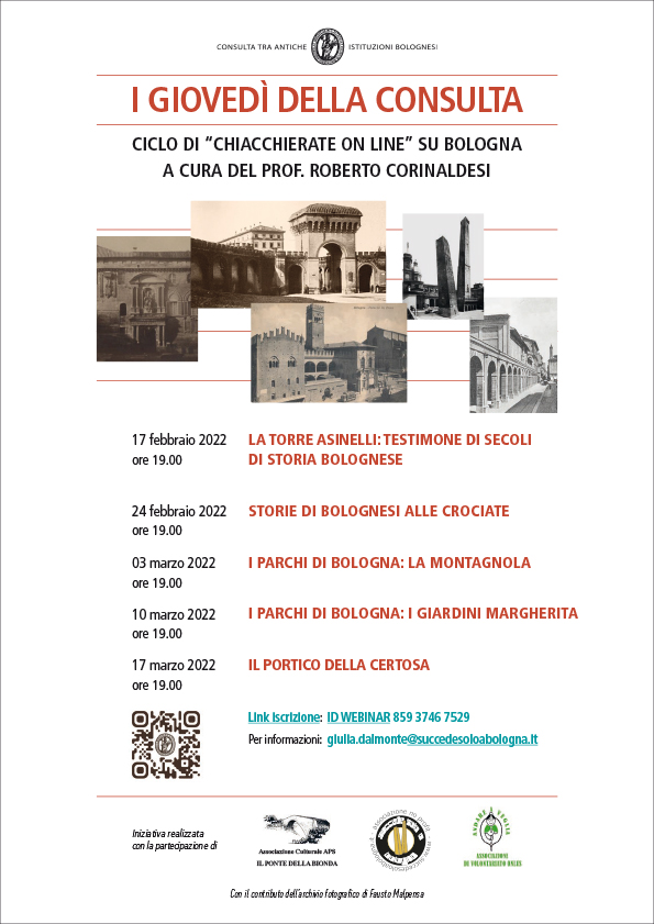 Dopo il successo dello scorso anno, riprendono le “chiacchierate on line” dedicate a Bologna, ai luoghi e ai personaggi che l’hanno nobilitata curate dal professor Roberto Corinaldesi ogni giovedì alle ore 19.00, a partire dal 17 febbraio.